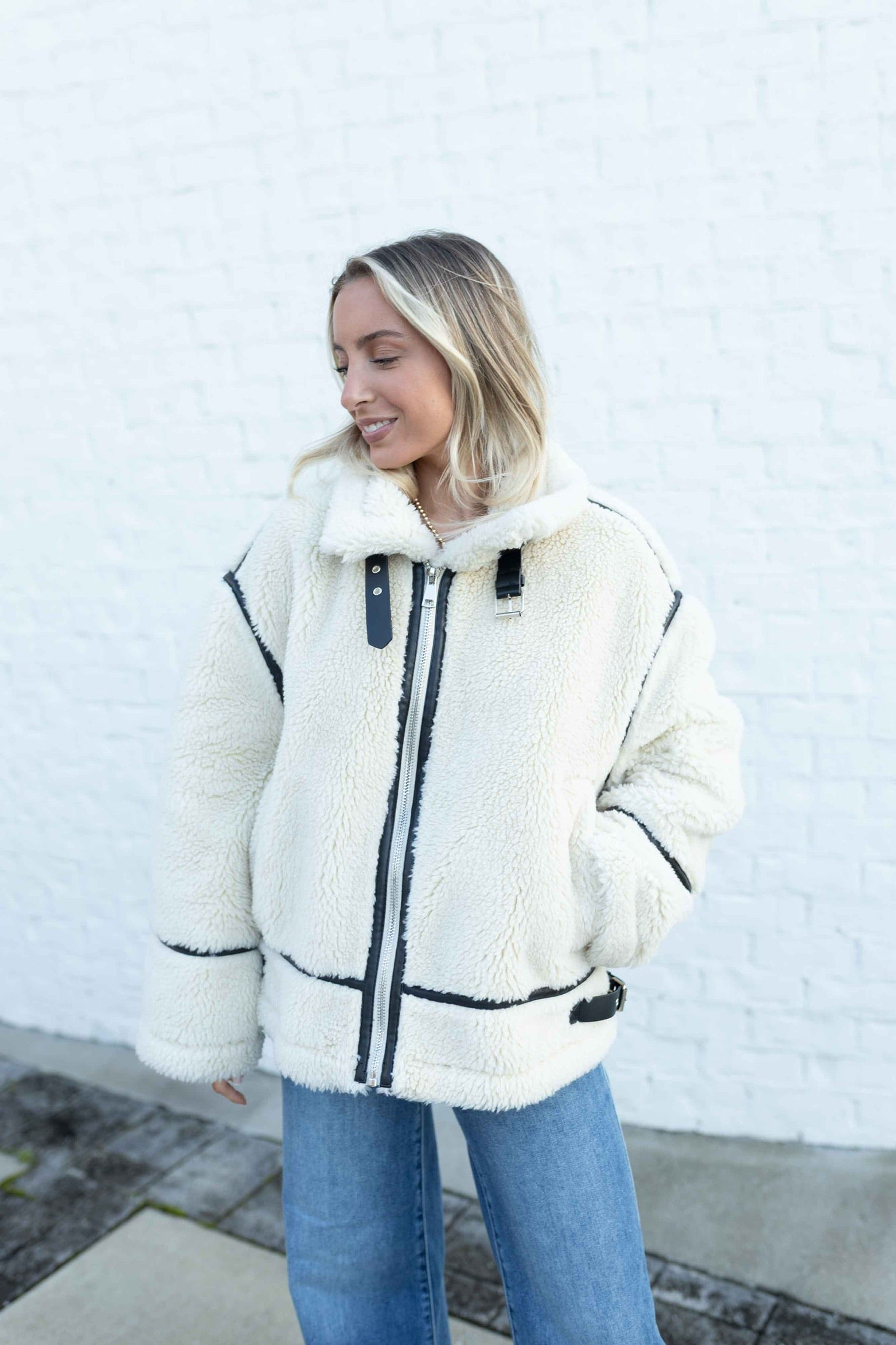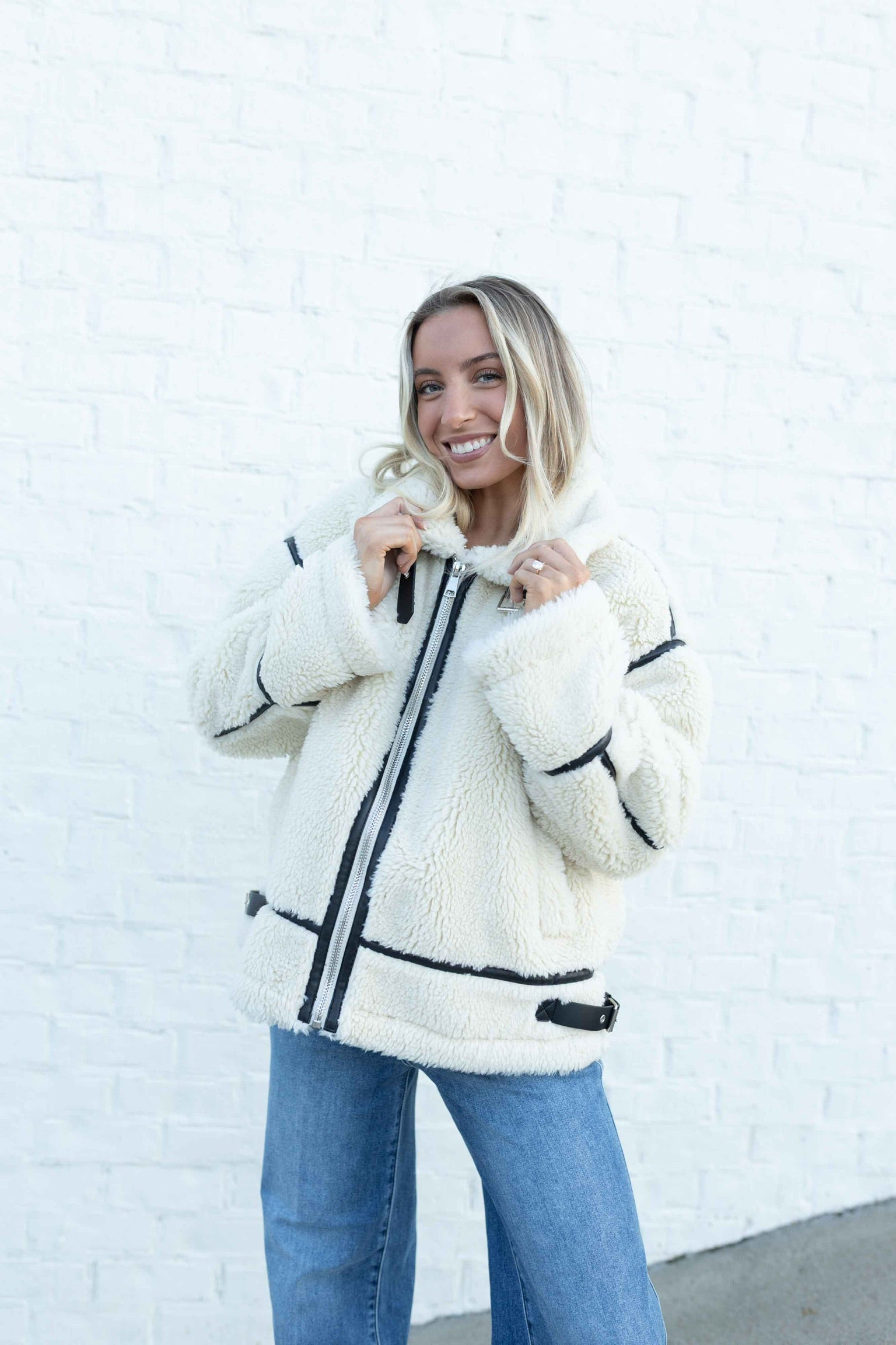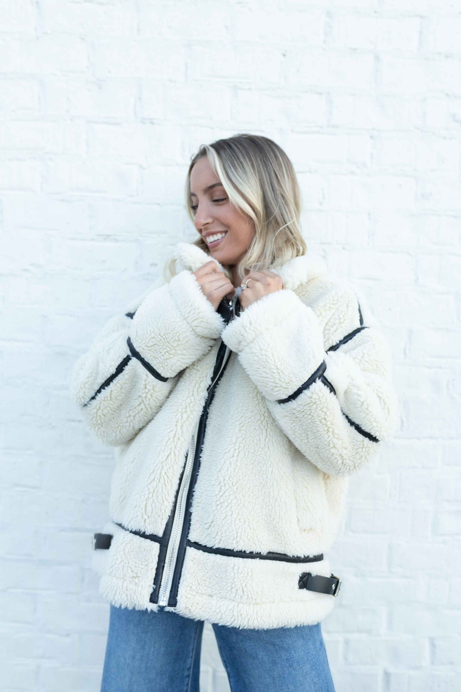 Edgy meets chic in this faux sherpa jacket with vegan leather trim and silver buckle detailing.